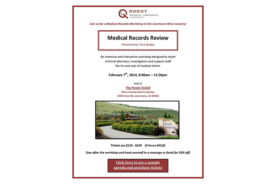 The discounted pre-registration rate ends 1/5, don’t miss this opportunity to get in the know about medical record review. 4 hours of MCLE and a chance to get your own case analyzed by a medical expert (included in fee). Come see us in Livermore for our extensive workshop on medical records for attorneys.